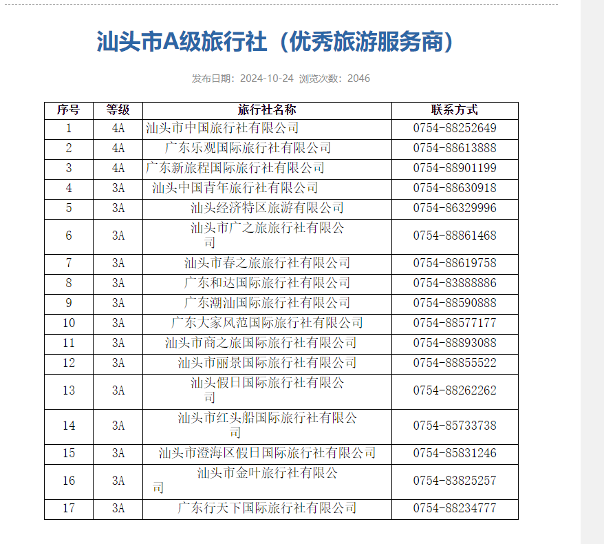 附件:汕头市A级旅行社名录